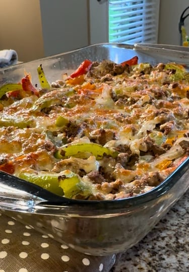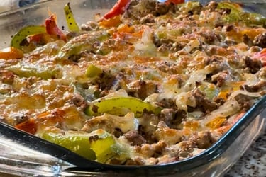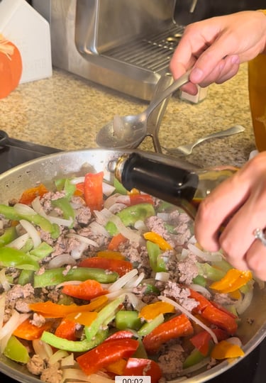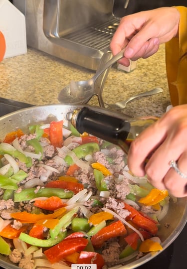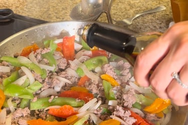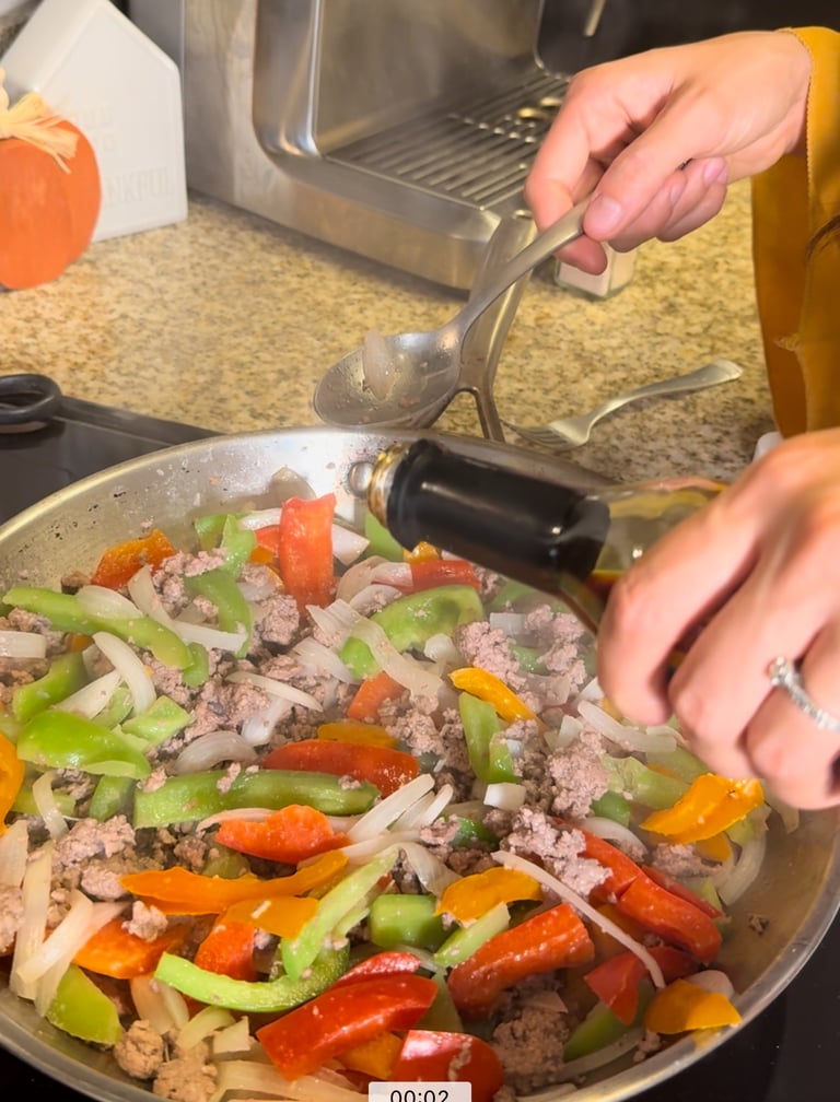 Chop onions and peppers into thin strips and cook veggies with ground beef on a pan in 1 tbs of butter and 3 tbs of coconut aminos. Make sure to cook your beef and veggies all the way through.